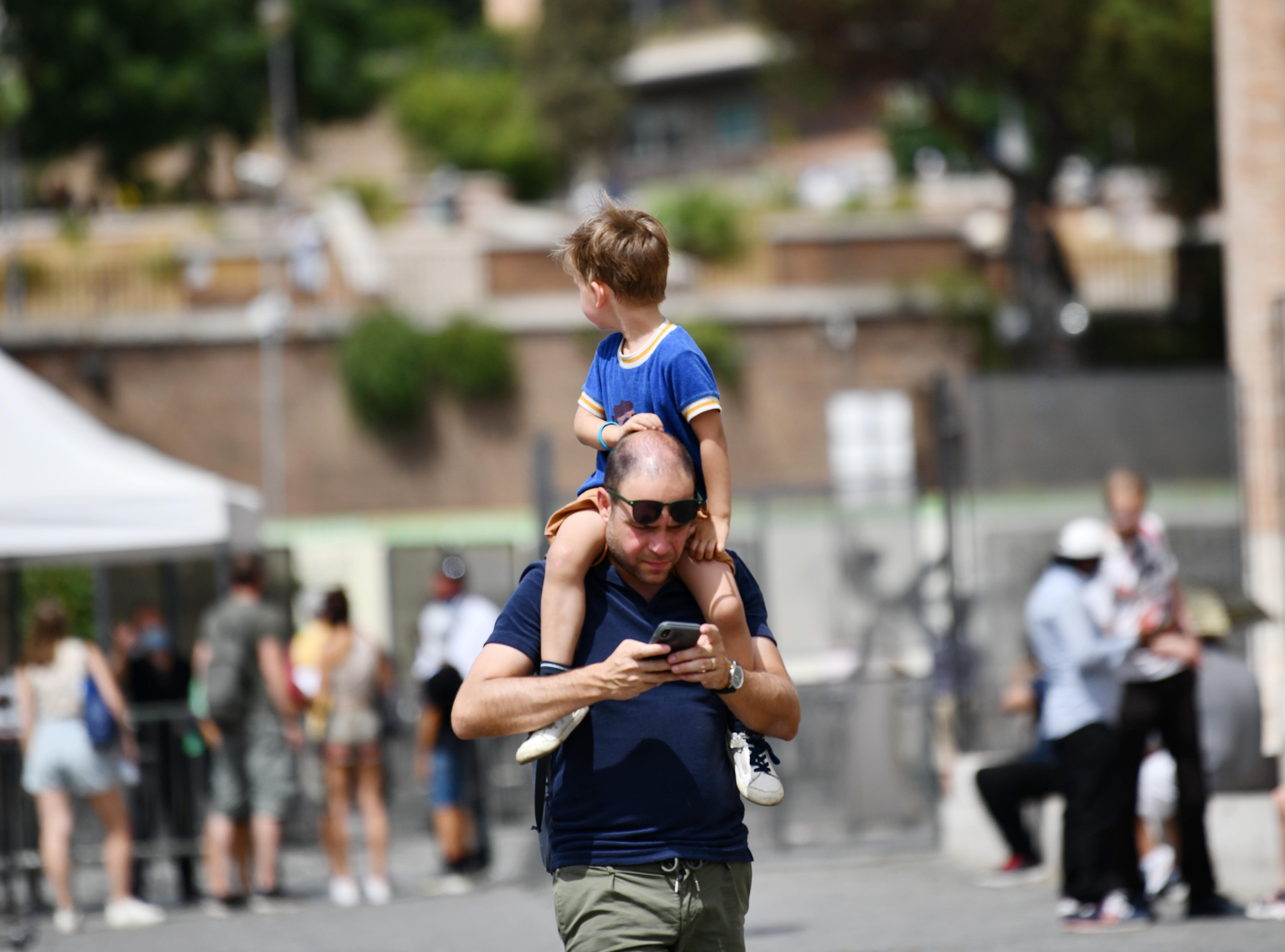 A child sits on a man's shoulders near the Colosseum in Rome, Italy, Aug. 4, 2021. (Xinhua/Jin Mamengni)
