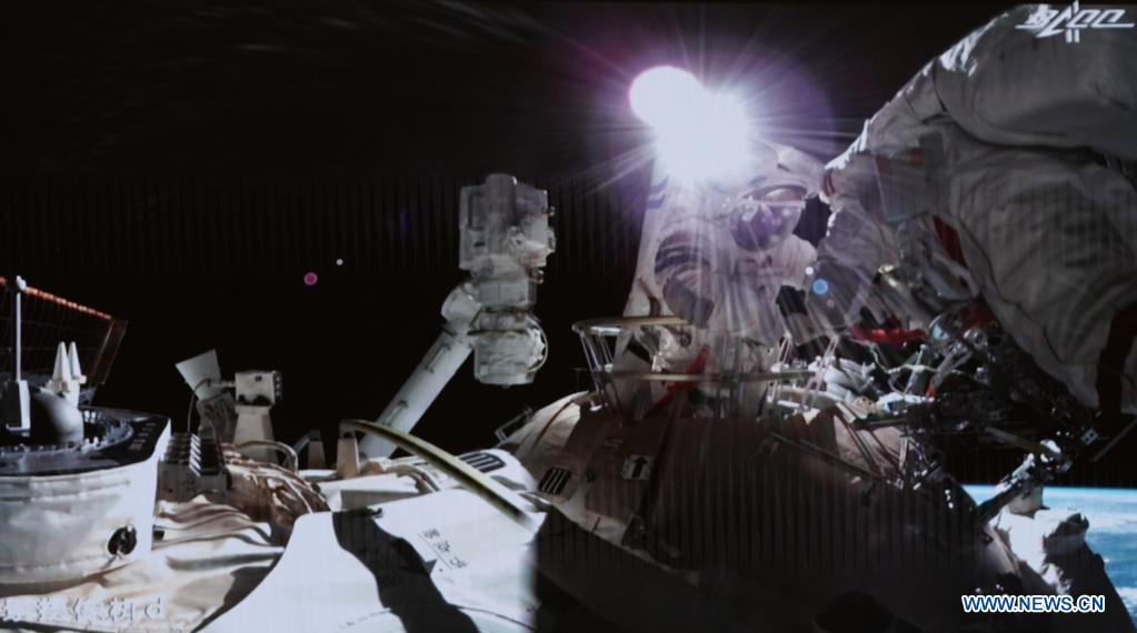 Screen image taken at Beijing Aerospace Control Center on Aug. 20, 2021 shows Chinese astronauts Nie Haisheng and Liu Boming conducting extravehicular activities (EVAs) out of the space station core module Tianhe. (Xinhua/Tian Dingyu)