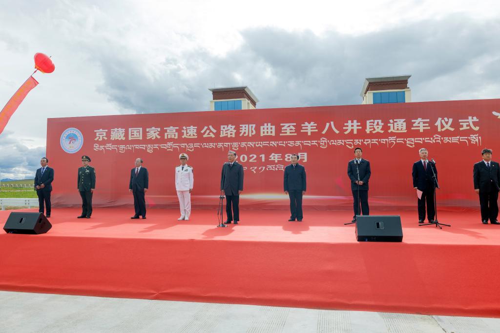 Wang Yang, a member of the Standing Committee of the Political Bureau of the Communist Party of China Central Committee and chairman of the National Committee of the Chinese People's Political Consultative Conference, who is leading a central delegation to Tibet, announces the opening of an expressway linking Nagqu and Yangbajain, southwest China's Tibet Autonomous Region. Wang Yang, leading a division of the central delegation, visited the city of Nagqu on Aug. 20, 2021. (Xinhua/Liu Bin)