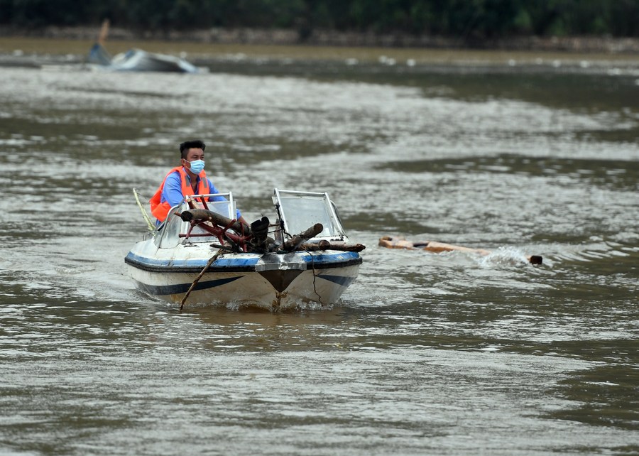 A staff member clears debris from a local reservoir in flood-hit Qixian County of Hebi City, central China's Henan Province, July 28, 2021. (Xinhua/Li Jianan)