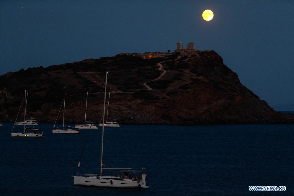 A full moon is seen over the Temple of Poseidon at cape Sounion, some 70 km southeast of Athens, Greece, on Aug. 21, 2021. (Xinhua/Marios Lolos)