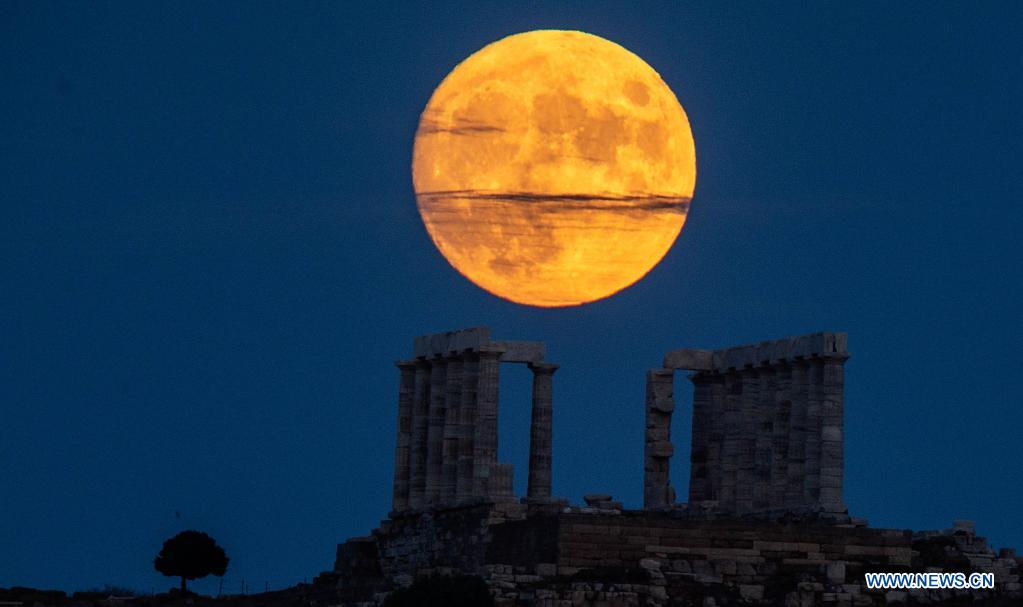 A full moon is seen over the Temple of Poseidon at cape Sounion, some 70 km southeast of Athens, Greece, on Aug. 21, 2021. (Xinhua/Marios Lolos)