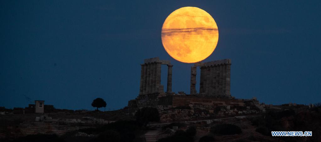 A full moon is seen over the Temple of Poseidon at cape Sounion, some 70 km southeast of Athens, Greece, on Aug. 21, 2021. (Xinhua/Marios Lolos)