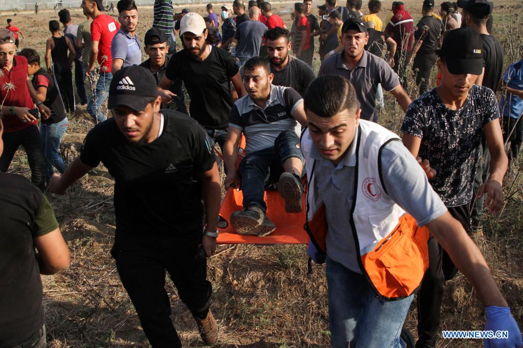 People carry an injured man during a protest to mark 52nd anniversary of burning Al-Aqsa Mosque in East Jerusalem, on the Gaza-Israel border in east of southern Gaza Strip city of Khan Younis, Aug. 21, 2021. Dozens of Palestinian protesters were injured on Saturday in clashes with Israeli soldiers near the border between eastern Gaza Strip and Israel, Palestinian medics said. (Photo by Rizek Abdeljawad/Xinhua)
