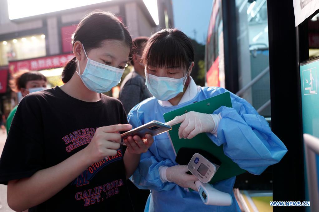 A medical worker helps a girl register for COVID-19 vaccination outside a mobile vaccination vehicle in Beibei District of southwest China's Chongqing, Aug. 20, 2021. Mobile vaccination vehicles were in service between 6 p.m. and 10 p.m. in some parts of Beibei District to facilitate COVID-19 vaccination. (Photo by Qin Tingfu/Xinhua)