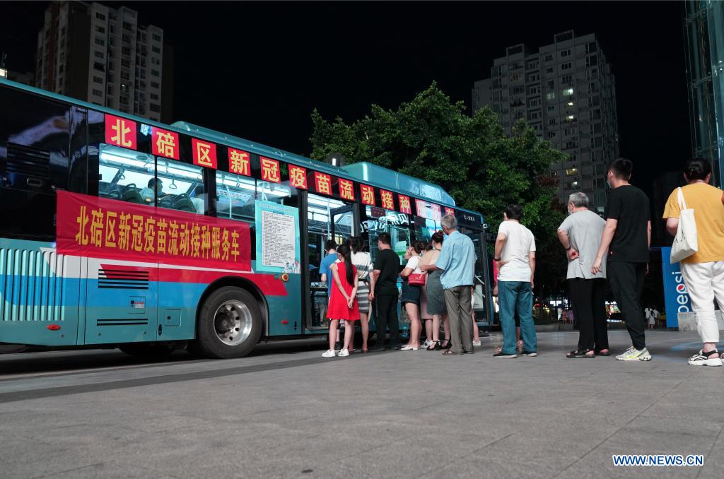 People line up to get inoculated against the COVID-19 outside a mobile vaccination vehicle in Beibei District of southwest China's Chongqing, Aug. 20, 2021. Mobile vaccination vehicles were in service between 6 p.m. and 10 p.m. in some parts of Beibei District to facilitate COVID-19 vaccination. (Photo by Qin Tingfu/Xinhua)