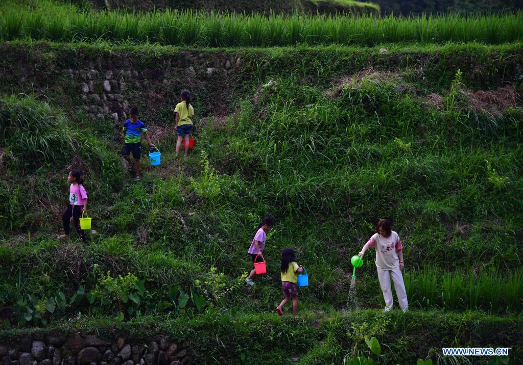 Colloge student Pan Muzhi (1st R) waters saplings with local pupils at Wuying Village, which lies on the border between south China's Guangxi Zhuang Autonomous Region and southwest China's Guizhou Province, on July 14, 2021. In the summer of 2021, a volunteer team consisted of college and middle school students led local pupils to participate in diverse activities, such as maintaining saplings, learning about intangible cultural heritages and collecting old farm tools for museums. (Xinhua/Huang Xiaobang)