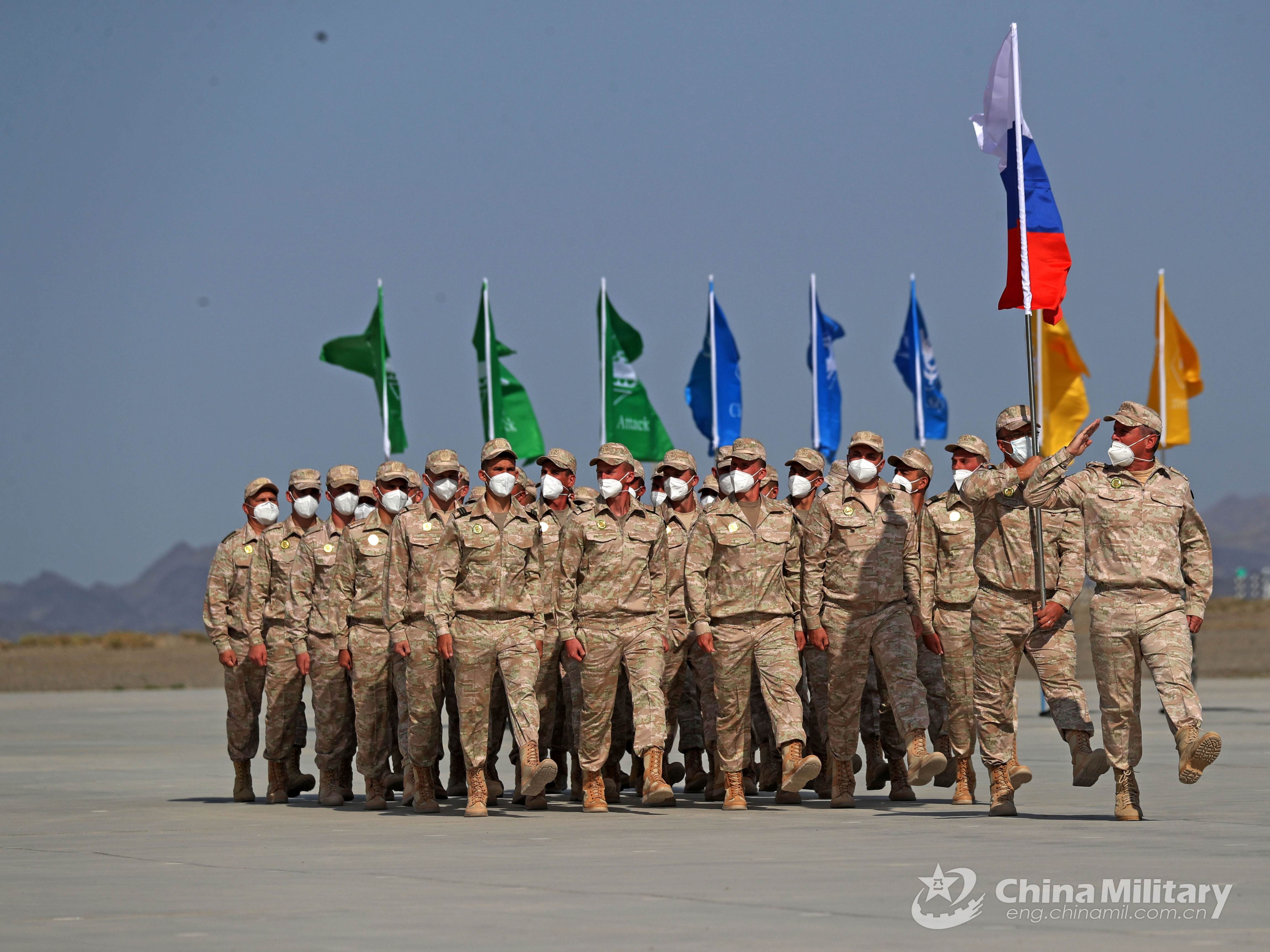 The opening ceremony of three competitions of the International Army Games (IAG) 2021 is held at the "Suvorov Attack" competition venue in Korla, northwest China's Xinjiang Uygur Autonomous Region, on August 22, 2021. The picture shows the Russian participating troops march past the reviewing stand at the ceremony. (Photo by Luo Xingcang)