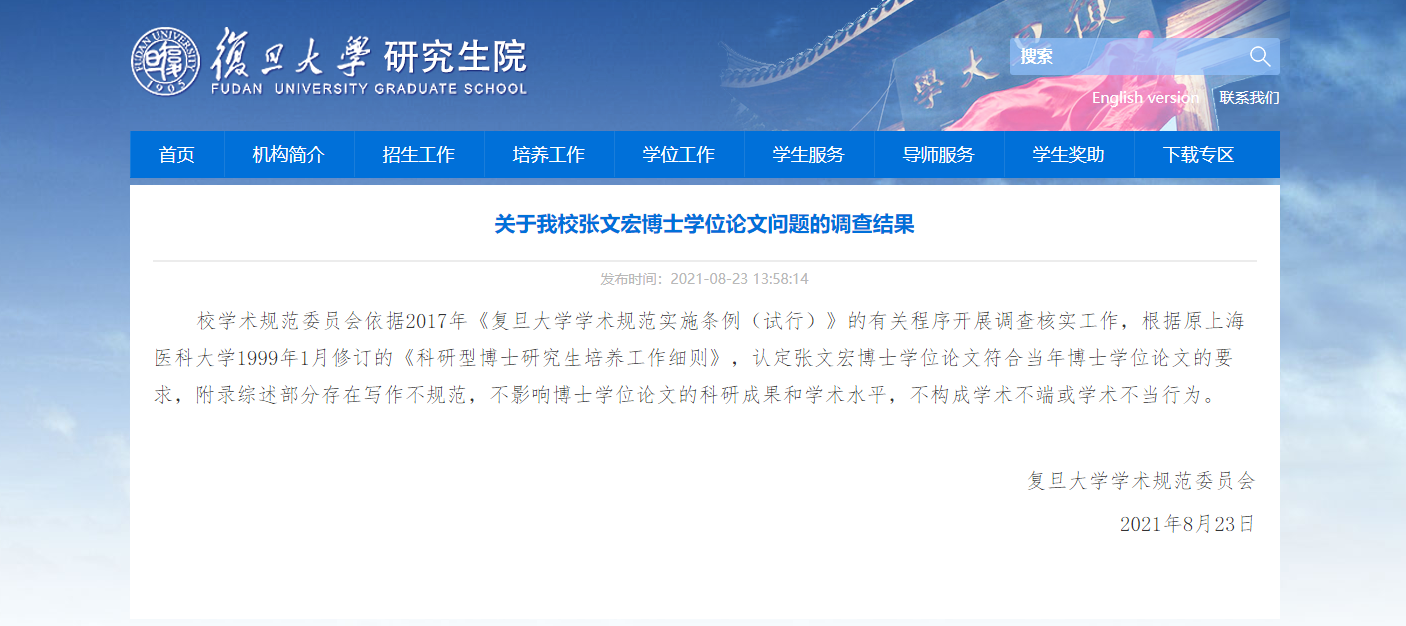 A screenshot shows the result of the investigation into the doctoral dissertation by Zhang Wenhong by the Fudan University Graduate School, on Aug 23, 2021. [Photo/screenshot from official website of Fudan University Graduate School]