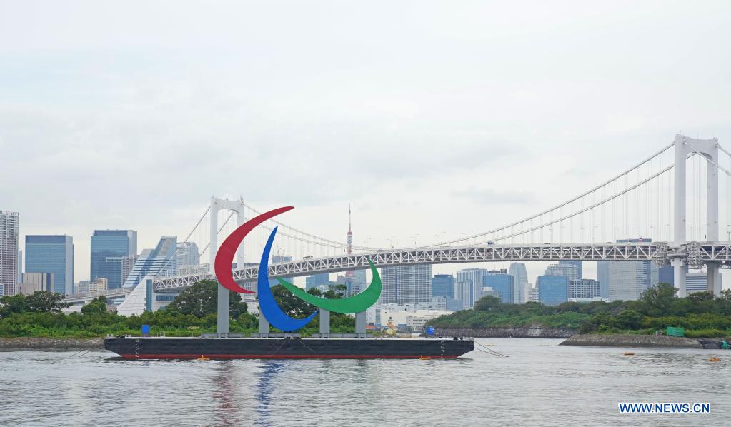 Photo taken on Aug 23, 2021 shows the Paralympic Games symbol of "Three Agitos" in the Tokyo Bay area in Tokyo, Japan. The Tokyo Paralympic Games will open on August 24 and close on September 5. [Photo/Xinhua]