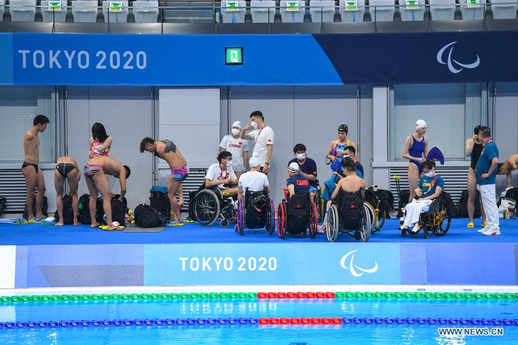 Chinese athletes attend a training session at the Tokyo Aquatics Centre in Tokyo, Japan, Aug. 23, 2021. (Xinhua/Cheong Kam Ka)
