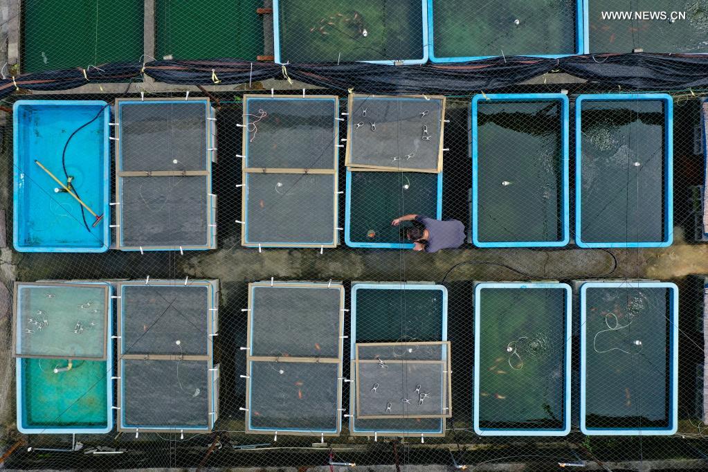 Aerial photo taken on Aug. 24, 2021 shows Gao Feng looking after goldfish in his yard, Shaoxing City, east China's Zhejiang Province. Gao Feng, a 43-year-old goldfish enthusiast, has been raising goldfish for nearly 20 years in his yard on the outskirts of Shaoxing City. Now his breeding base can reproduce nearly 1,000 high-quality goldfish every year. (Xinhua/Weng Xinyang)