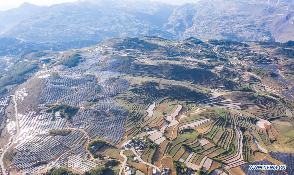 Aerial photo taken on April 26, 2020 shows a photovoltaic power station in Weining Yi, Hui and Miao Autonomous County, Bijie, southwest China's Guizhou Province. A project combining agriculture with photovoltaic power station was rolled out to promote rural vitalization. Villagers grow mushrooms at mushroom greenhouses built under photovoltaic solar panels, plant other agricultural products and herd sheep in the fields in the photovoltaic power station. (Xinhua/Tao Liang)