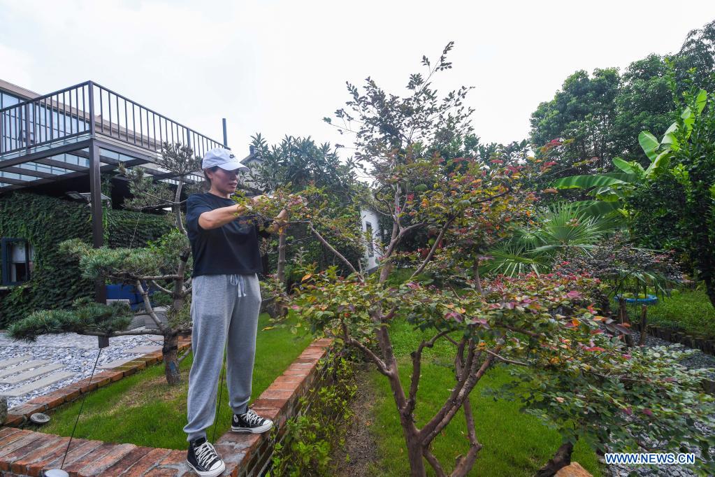 A villager trims a tree in her yard in Xingcheng Village of Haining City in Jiaxing, east China's Zhejiang Province, Aug. 26, 2021. Jiaxing has integrated its resources in line with local advantages to create a beautiful countryside in recent years, which promoted the development of tourism and agricultural industries in the rural areas. (Xinhua/Xu Yu)
