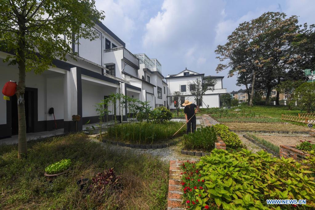 A villager works in his yard in Xingcheng Village of Haining City in Jiaxing, east China's Zhejiang Province, Aug. 26, 2021. Jiaxing has integrated its resources in line with local advantages to create a beautiful countryside in recent years, which promoted the development of tourism and agricultural industries in the rural areas. (Xinhua/Xu Yu)