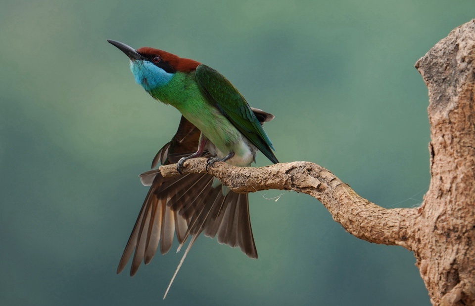 A blue-throated bee-eater is about to take off. (Photo/Li Guochao) |