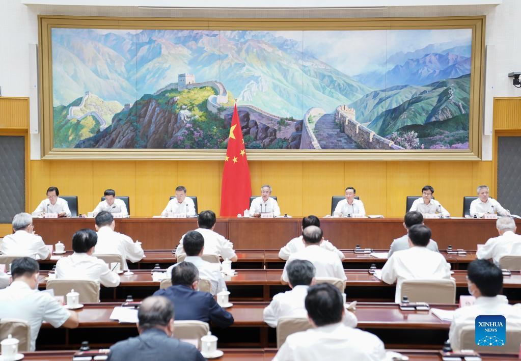 Chinese Vice Premier Hu Chunhua, also a member of the Political Bureau of the Communist Party of China Central Committee, attends a teleconference on promoting the vitalization of the seed industry in Beijing, capital of China, Aug. 27, 2021. (Xinhua/Li Xiang)