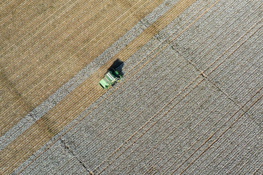 Aerial file photo taken on Oct. 17, 2020 shows a machine harvesting cotton in a field in Wenjiazhuang Village, Manas County of northwest China's Xinjiang Uygur Autonomous Region. (Xinhua/Ding Lei)