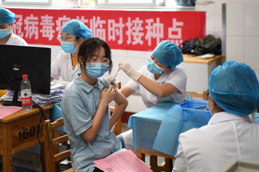 A student gets inoculated against the COVID-19 at a middle school in Changsha, capital city of central China's Hunan Province, Aug. 14, 2021. (Xinhua/Xue Yuge)