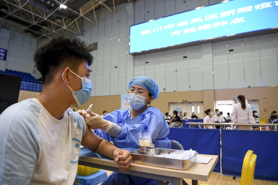 A medical worker administers a dose of COVID-19 vaccine for a student at a vaccination site in Jinfeng district of Yinchuan, northwest China's Ningxia Hui Autonomous Region, Aug. 15, 2021. (Xinhua/Feng Kaihua)