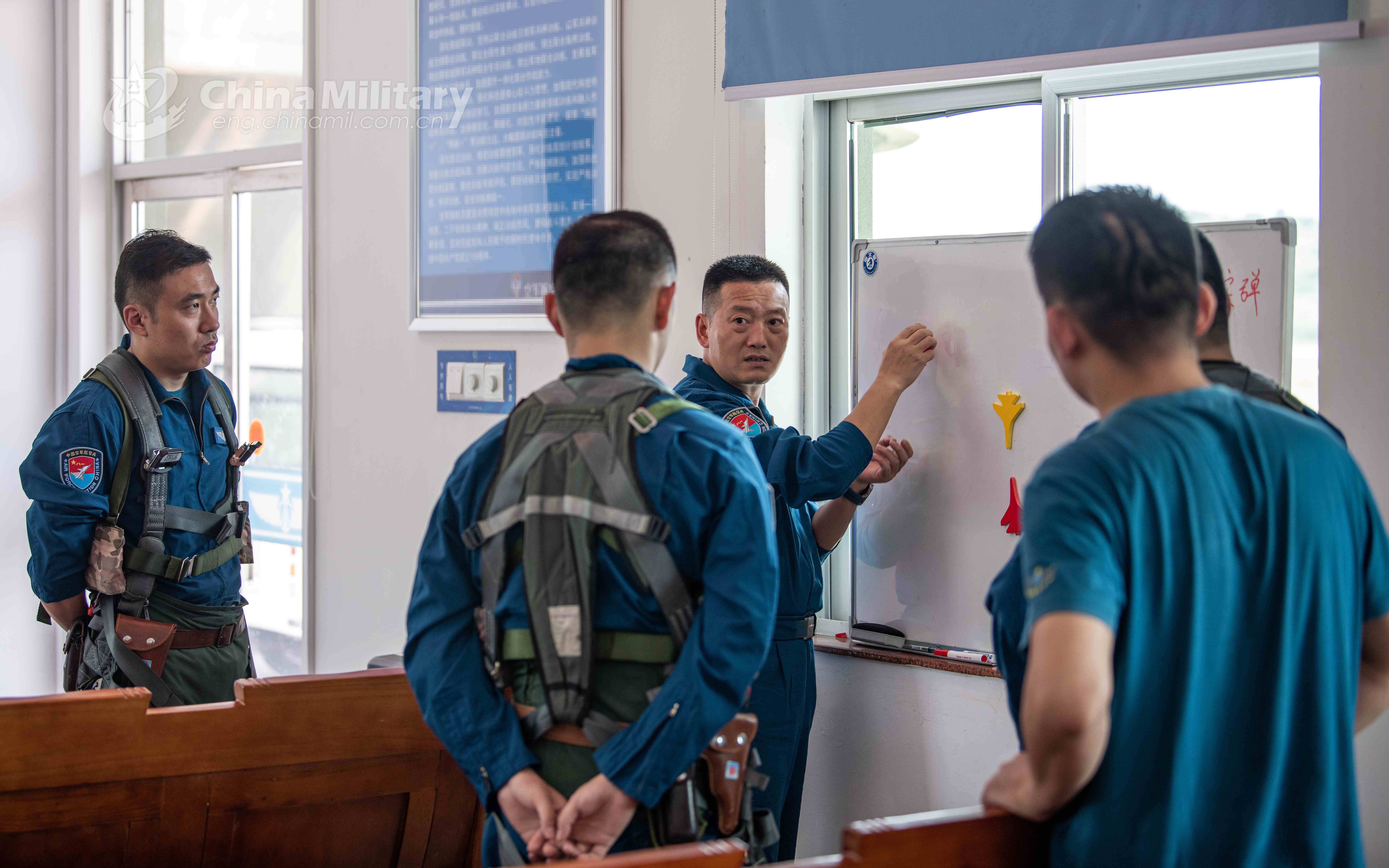 Pilots assigned to an aviation brigade of the air force under the PLA Eastern Theater Command make review and summary after a round-the-clock fight training exercise on August 24, 2021. (eng.chinamil.com.cn/Photo by Zhang Shu)
