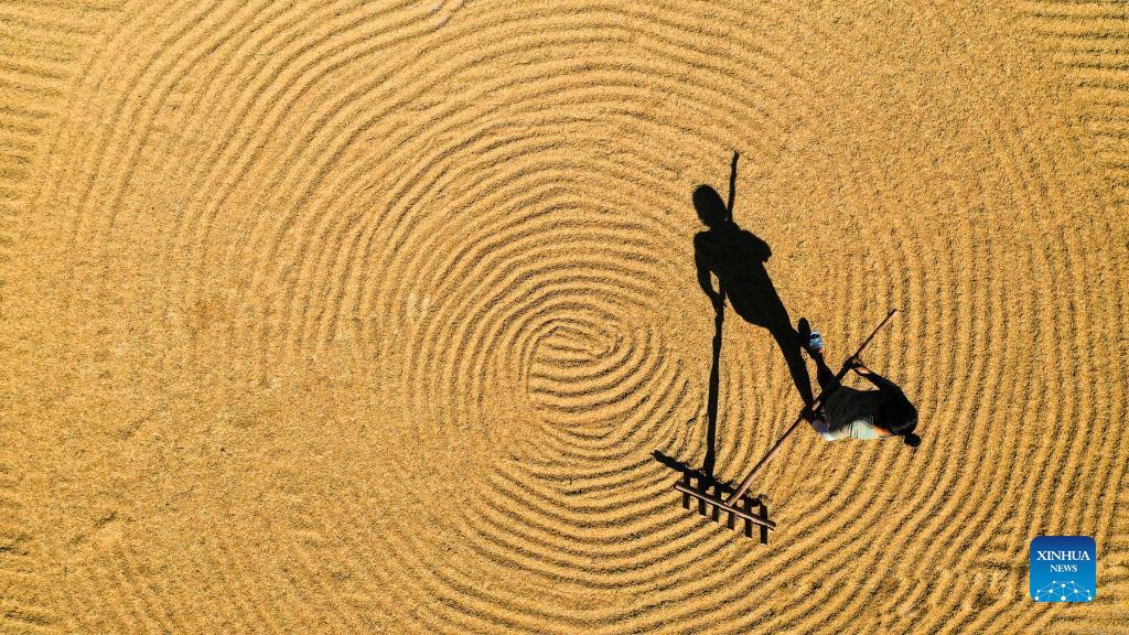 Aerial photo taken on Aug. 30, 2021 shows a farmer drying paddy rice in Shanshu Village of Changning, central China's Hunan Province. (Photo by Zhou Xiuyuchun/Xinhua)