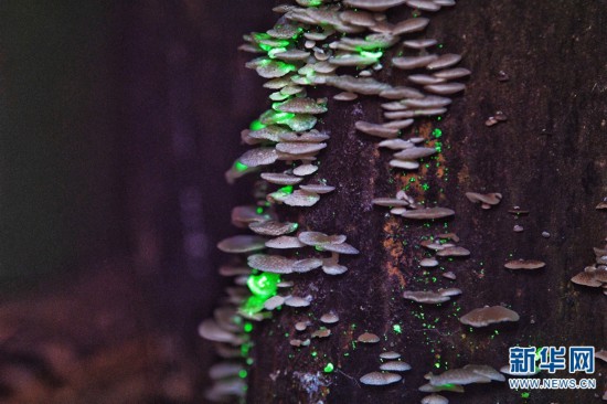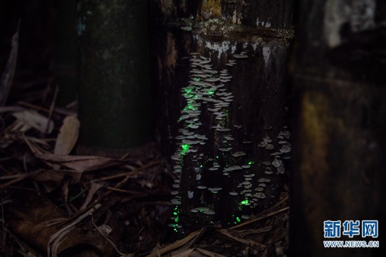 Rare bioluminescent mushrooms emit a greenish fluorescence at night at the Xishuangbanna Tropical Botanical Garden, Yunnan Province. (Photo/Xinhua)