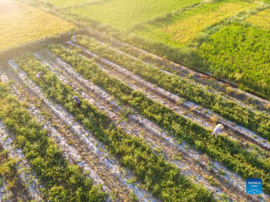 Aerial photo taken on Aug. 30, 2021 shows farmers working at a vegetable base in Qingtang Township, Daoxian County of Yongzhou City, central China's Hunan Province. (Xinhua/Chen Sihan)