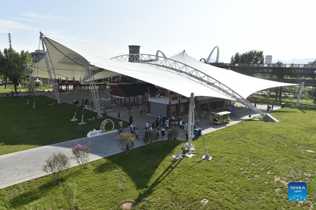 Journalists visit the venue of the China International Fair for Trade in Services (CIFTIS) at Shougang Park, a steel mill-turned cultural and sports complex, in Beijing, capital of China, Aug. 31, 2021. The CIFTIS, a major platform for trade in services in China, will take place from Sept. 2 to 7. With its traditional venue of the China National Convention Center hosting most of the CIFTIS events, eight thematic exhibitions and several forums and meetings of CIFTIS will take place for the first time in Shougang Park, its organizers said on Tuesday. (Xinhua/Lu Peng)
