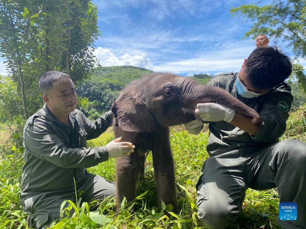 Rescuers feed the sick baby elephant in Xishuangbanna Dai Autonomous Prefecture, southwest China's Yunnan Province, Aug. 29, 2021. A newborn baby elephant in Xishuangbanna was abandoned by its herd only six days after its birth due to severe diseases including suppuration of umbilical cord. Local authorities have carried out emergency treatment for the ailing baby elephant. The doctor who is in charge of its treatment said on Tuesday that the baby elephant had recovered from its fever, and its illness and mental state showed a trend of improvement, yet the baby elephant was still not out of danger. (The Asian Elephant Breeding and Rescue Center in Xishuangbanna National Nature Reserve/Handout via Xinhua)