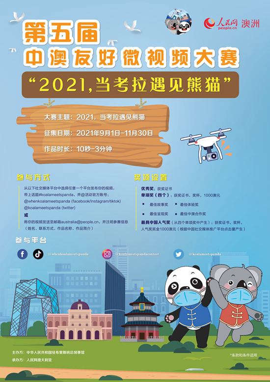 SYDNEY, Aug.31 (People’s Daily Online) – “When Koala Meets Panda” is back again! Initiated by the Consulate-General of the People’s Republic of China in Brisbane and organized by People’s Daily Online Australia, “When Koala Meets Panda” 2021 China-Australia Short Video Contest will kick off on Sept.1, 2021.