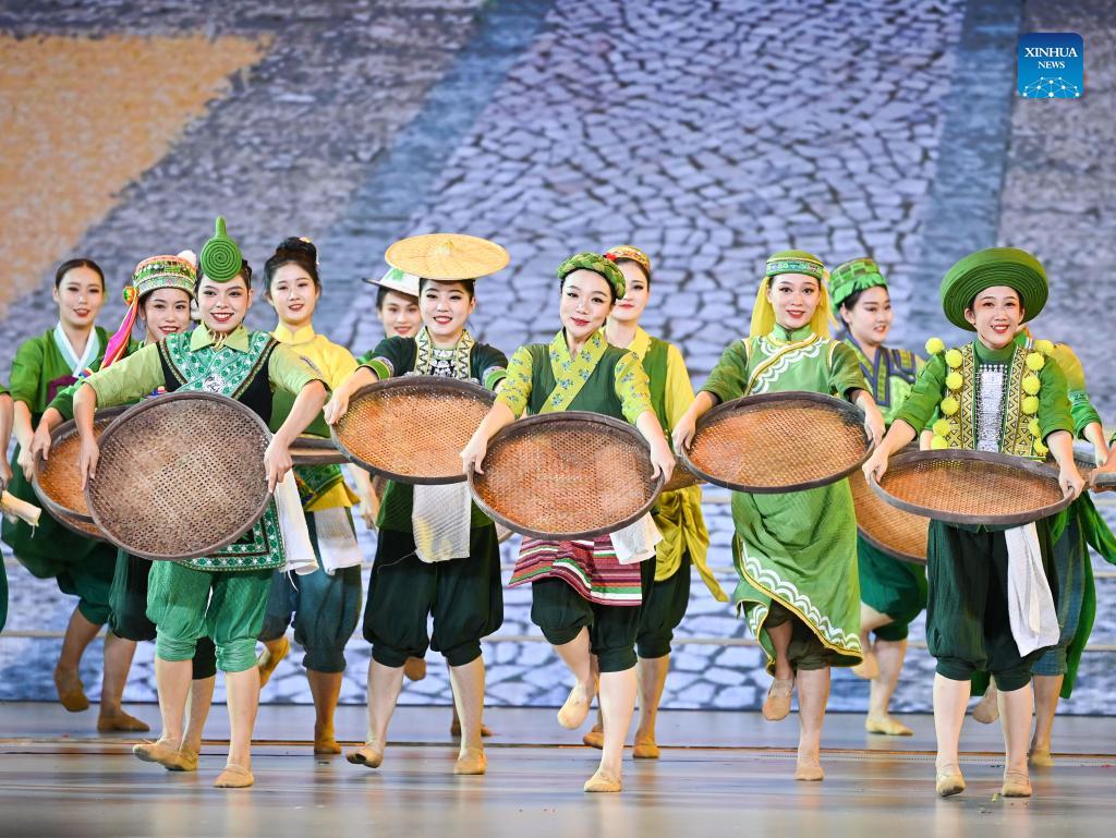 Artists dance at an opening gala of the sixth ethnic minority art festival in Beijing, capital of China, Aug. 31, 2021. The opening gala of the sixth ethnic minority art festival was held in Beijing on Tuesday evening. (Xinhua/Li Xiang)