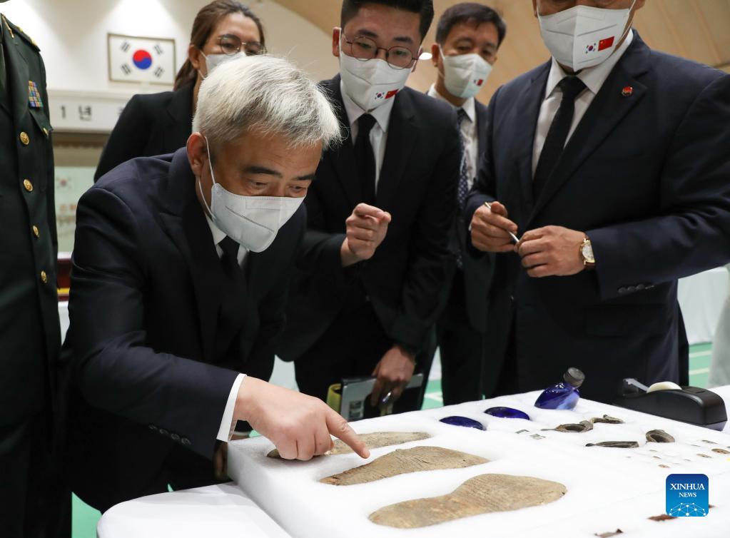 The Chinese delegation members attend a ceremony to lay the remains of Chinese soldiers killed in the 1950-53 Korean War, in Incheon, South Korea, Sept. 1, 2021. The remains of 109 Chinese soldiers killed in the 1950-53 Korean War were casketed in South Korea on Wednesday to be sent back to China. The ceremony to lay the 109 remains in coffins was held in Incheon, west of the capital Seoul. (Xinhua/Wang Jingqiang)