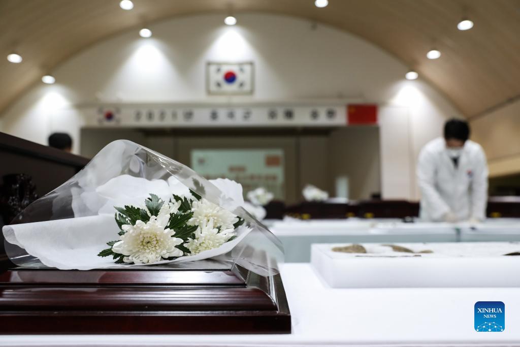 Remains of Chinese soldiers killed in the 1950-53 Korean War are casketed in Incheon, South Korea, Sept. 1, 2021. The remains of 109 Chinese soldiers killed in the 1950-53 Korean War were casketed in South Korea on Wednesday to be sent back to China. The ceremony to lay the 109 remains in coffins was held in Incheon, west of the capital Seoul. (Xinhua/Wang Jingqiang)