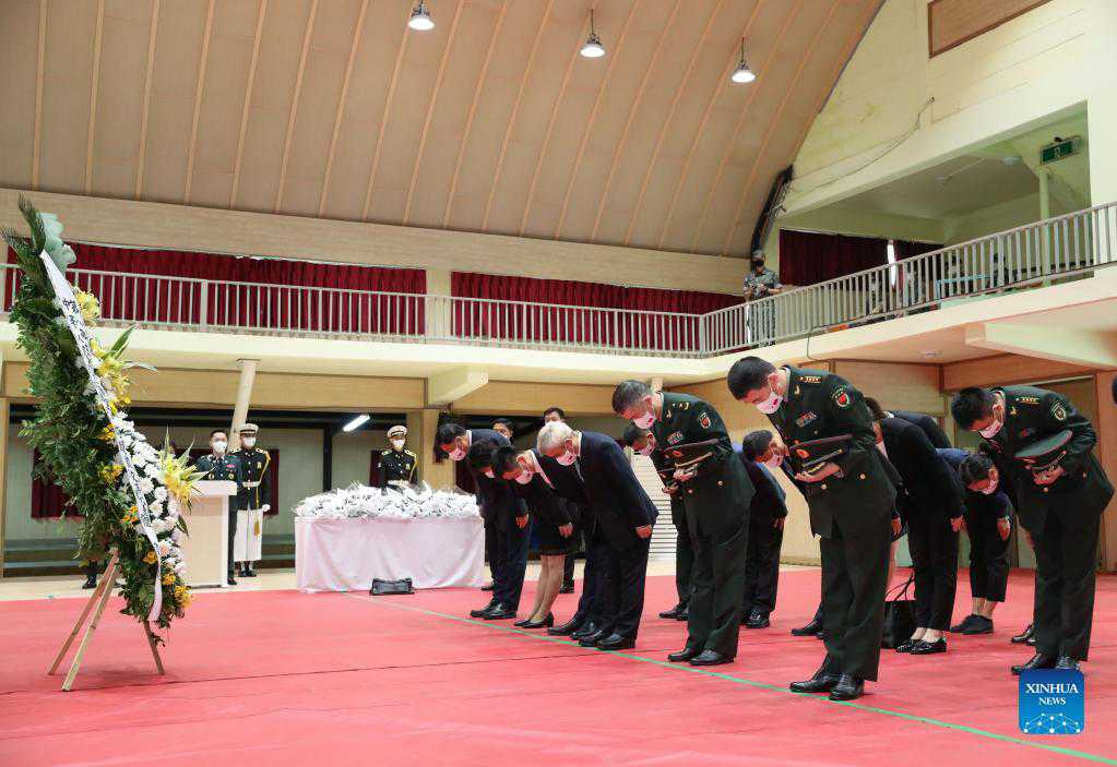 The Chinese delegation members bow to show respect during the ceremony to lay the remains of Chinese soldiers killed in the 1950-53 Korean War in coffins in Incheon, South Korea, Sept. 1, 2021. The remains of 109 Chinese soldiers killed in the 1950-53 Korean War were casketed in South Korea on Wednesday to be sent back to China. The ceremony to lay the 109 remains in coffins was held in Incheon, west of the capital Seoul. (Xinhua/Wang Jingqiang)