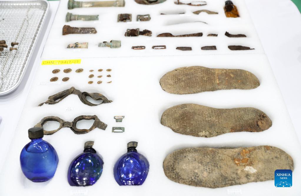 Photo taken on Sept. 1, 2021 shows related relics of Chinese soldiers killed in the 1950-53 Korean War, in Incheon, South Korea. The remains of 109 Chinese soldiers killed in the 1950-53 Korean War were casketed in South Korea on Wednesday to be sent back to China. The ceremony to lay the 109 remains in coffins was held in Incheon, west of the capital Seoul. (Xinhua/Wang Jingqiang)