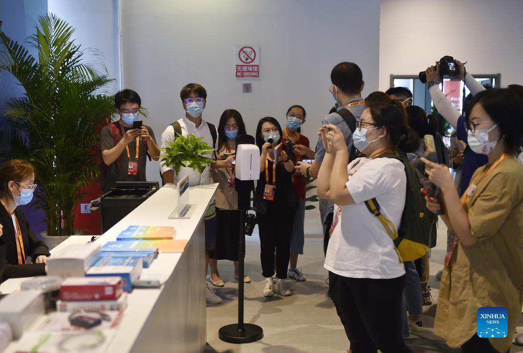 Journalists visit the media center of the China International Fair for Trade in Services (CIFTIS) at the China National Convention Center in Beijing, capital of China, Sept. 1, 2021. The media center of the CIFTIS started trial operation on Wednesday. The CIFTIS is to be held from Sept. 2 to 7 this year. (Xinhua/Lu Peng)