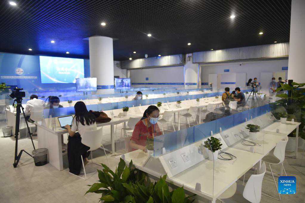 Journalists work at the media center of the China International Fair for Trade in Services (CIFTIS) at the China National Convention Center in Beijing, capital of China, Sept. 1, 2021. The media center of the CIFTIS started trial operation on Wednesday. The CIFTIS is to be held from Sept. 2 to 7 this year. (Xinhua/Lu Peng)