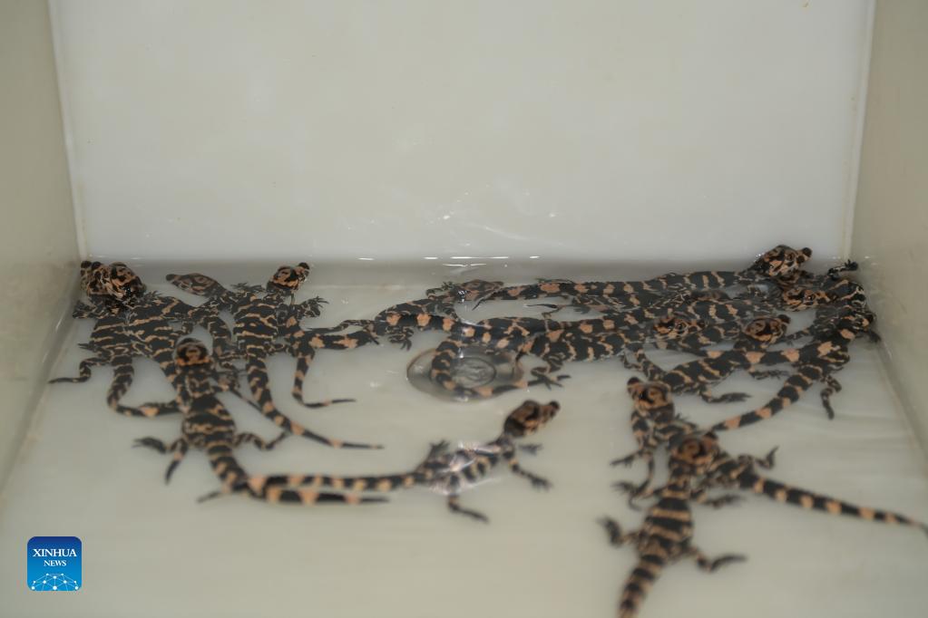 Baby Chinese alligators are seen in a breeding box at the Anhui Chinese alligator national nature reserve in Xuancheng City, east China's Anhui Province, Aug. 31, 2021. More than 1,000 artificially-bred Chinese alligators at the Anhui Chinese alligator national nature reserve entered their hatching period in recent days. (Xinhua/Han Xu)