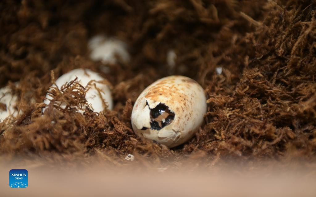 A baby Chinese alligator breaks its eggshell at the Anhui Chinese alligator national nature reserve in Xuancheng City, east China's Anhui Province, Aug. 31, 2021. More than 1,000 artificially-bred Chinese alligators at the Anhui Chinese alligator national nature reserve entered their hatching period in recent days. (Xinhua/Han Xu)