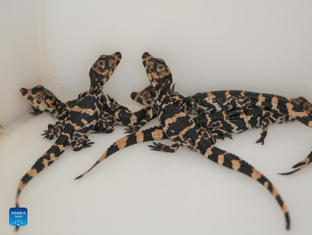 Baby Chinese alligators are seen in a breeding box at the Anhui Chinese alligator national nature reserve in Xuancheng City, east China's Anhui Province, Aug. 31, 2021. More than 1,000 artificially-bred Chinese alligators at the Anhui Chinese alligator national nature reserve entered their hatching period in recent days. (Xinhua/Han Xu)