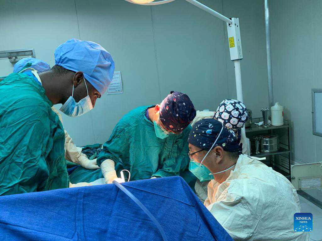 File photo taken on Feb. 26, 2021 shows Chinese doctors and a Rwandan doctor performing an operation at Masaka Hospital in Kigali, Rwanda. Chinese medical doctors' presence in Masaka Hospital, Masaka Sector in the city suburbs of Kigali is transforming the healthcare services in Rwanda by providing specialized medical care to Rwandan patients. (Feng Kai/the 21st batch of Inner Mongolia aid Rwanda medical team/Handout via Xinhua)