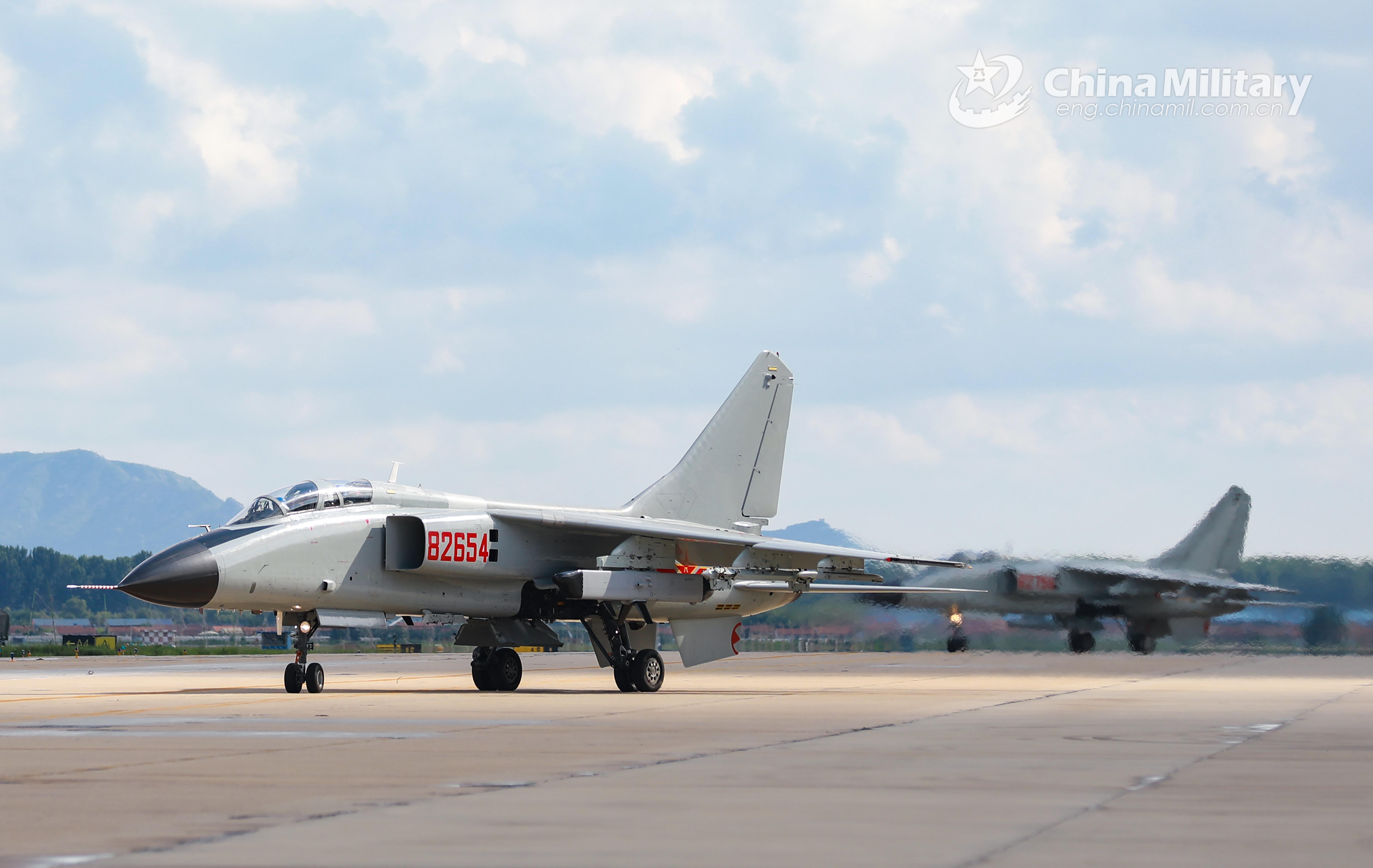 Fighter bombers attached to a naval aviation brigade under the PLA Northern Theater Command taxi in formation to the take-off line during a recent round-the-clock flight training exercise. (eng.chinamil.com.cn/Photo by Yu Zhengqing and Zhang Qiang)