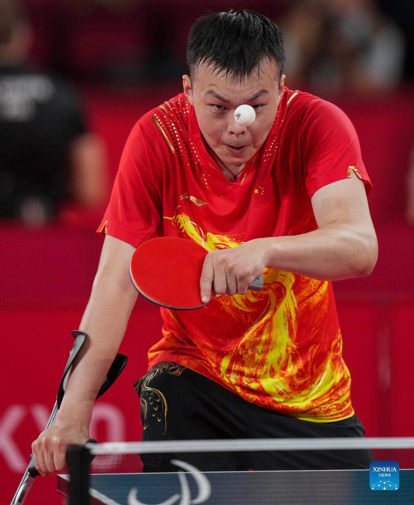 Yan Shuo of China competes during the men's team classes 6-7 semifinal of table tennis event at the Tokyo 2020 Paralympic Games in Tokyo, Japan, Sept. 1, 2021. (Xinhua/Hu Huhu)