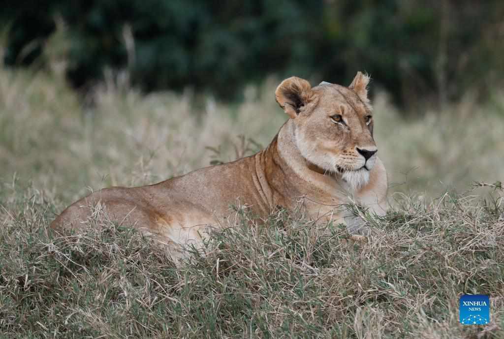 Photo taken on Aug. 30, 2021 shows a lion at Maasai Mara National Reserve in southwestern Kenya. Kenya has released the results of a three-month wildlife census that reveal a slight increase in the population of iconic large herbivores including elephants and rhinos (Xinhua/Long Lei)
