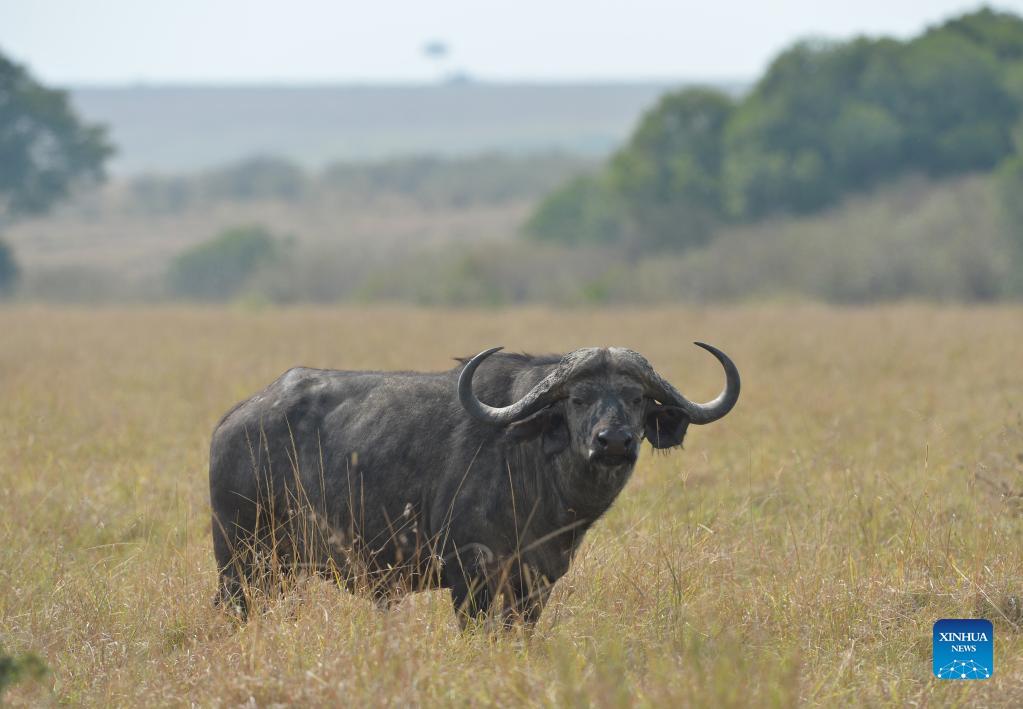 Photo taken on Aug. 31, 2021 shows a buffalo at Maasai Mara National Reserve in southwestern Kenya. Kenya has released the results of a three-month wildlife census that reveal a slight increase in the population of iconic large herbivores including elephants and rhinos. (Xinhua/Dong Jianghui)