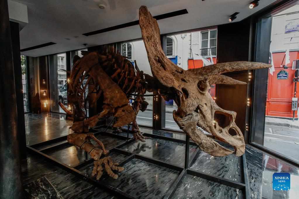 A skeleton of a triceratops is exposed ahead of its auction sale at Drouot auction house in Paris, France, Sept. 1, 2021. "Big John", the triceratops with an 8-meter long skeleton, is on display in Paris until Oct. 20, before be auctioned. (Photo by Aurelien Morissard/Xinhua)