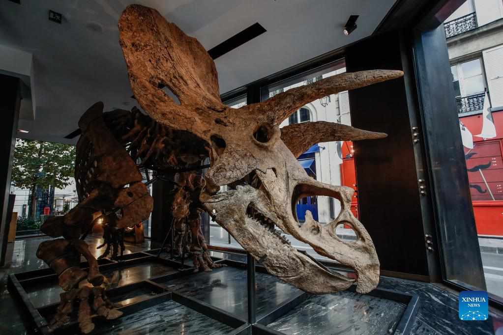 A skeleton of a triceratops is exposed ahead of its auction sale at Drouot auction house in Paris, France, Sept. 1, 2021. "Big John", the triceratops with an 8-meter long skeleton, is on display in Paris until Oct. 20, before be auctioned. (Photo by Aurelien Morissard/Xinhua)