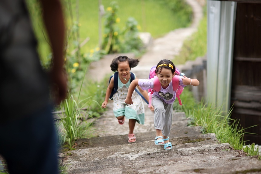 Mo Haifei (front) and Ou Xiuhui come to school at the teaching center in Danggan village, Paidiao town, Danzhai county in southwest China's Guizhou Province on Sept. 1, 2021. (Photo/People's Daily Online)