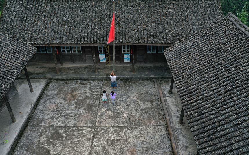 Yang Changjun and new first-graders hold a flag-raising ceremony at the teaching center in Danggan village, Paidiao town, Danzhai county in southwest China's Guizhou Province on Sept. 1, 2021. (Photo/People's Daily Online)